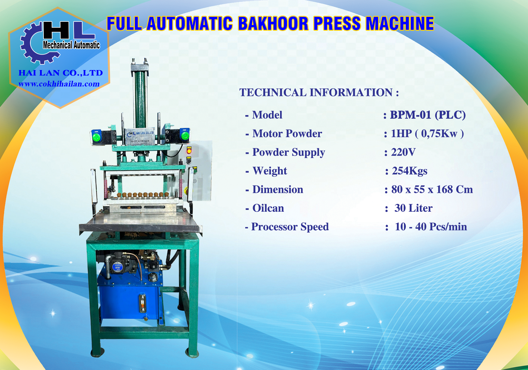 - The full automatic bakhoor press machine was designed and manufactured by Hai Lan Company. After a long period of research and multiple test runs, we have finally created the most perfected version of the product.